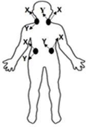 Fig: Schematic representation of the location of sEMG and ACC sensors, where X and Y represent the axis direction of accelerometer. Z axis is into plane of paper and Steps involved